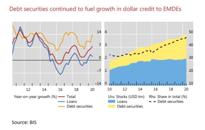 Ξεπέρασε τα 4 τρισ. δολάρια το χρέος σε δολάρια των αναδυόμενων αγορών για πρώτη φορά, μετά την αύξηση των εκδόσεων κατά τη διάρκεια της κρίσης Covid-19, σύμφωνα με στοιχεία της Τράπεζας Διεθνών Διακανονισμών (BIS).