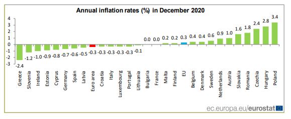 Για τέταρτη συνεχόμενη φορά, ο ετήσιος πληθωρισμός στην ευρωζώνη διατηρήθηκε στο -0,3% τον Δεκέμβριο. Εναν χρόνο πριν, ήταν στο 1,3%.