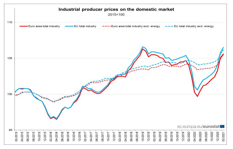 Σε σύγκριση με τον Φεβρουάριο του 2020, ο πληθωρισμός χονδρικής διαμορφώθηκε στο 1,5% στην ευρωζώνη και στο 1,7% στην ΕΕ.