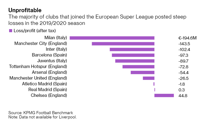 Η πλειοψηφία των ιδρυτικών κλαμπ είχαν καταγράψει μεγάλες ζημιές, όπως δείχνει το γράφημα (KPMG).