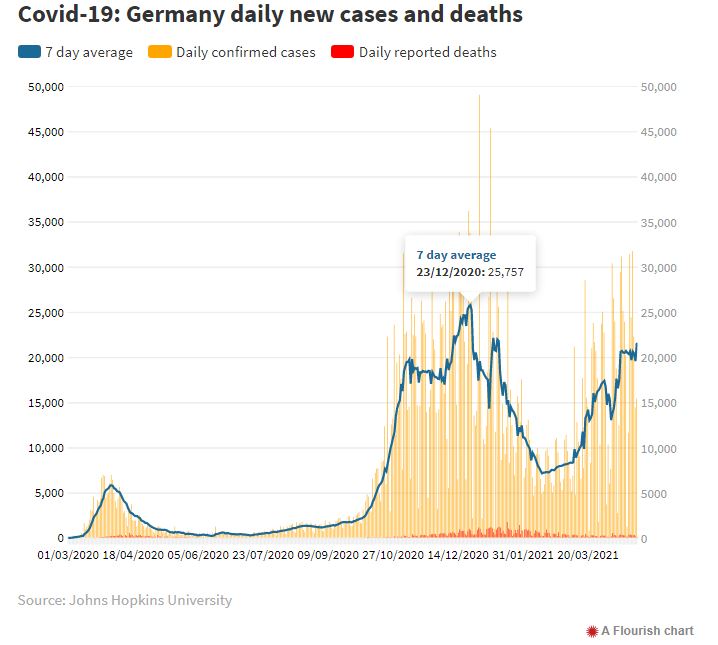 Η Γερμανία δίνει μάχη κατά του τρίτου κύματος, που οφείλεται σε μεγάλο βαθμό στην εξάπλωση του πιο μολυσματικού στελέχους του ιού που εμφανίστηκε για πρώτη φορά στο Ηνωμένο Βασίλειο το περασμένο φθινόπωρο.