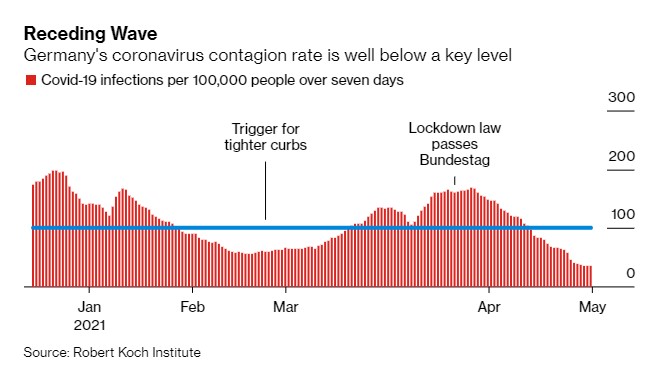 Την άρση της ισχύος του ομοσπονδιακού «φρένου έκτακτης ανάγκης» σε περίπτωση αύξησης των κρουσμάτων του κορωνοϊού προανήγγειλε για τις 30 Ιουνίου η Καγκελάριος 'Αγγελα Μέρκελ, εφόσον συνεχιστεί η πτωτική τάση των αριθμών. «Αν οι αριθμοί συνεχίσουν να πέφτουν, μπορούμε να έχουμε ένα πραγματικά καλό καλοκαίρι», δήλωσε ο υπουργός Υγείας Γενς Σπαν.