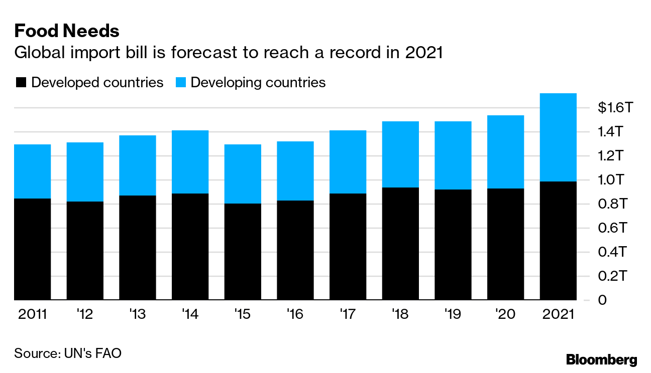 Ο παγκόσμιος λογαριασμός για τις εισαγωγές τροφίμων αναμένεται να ανέβει σε υψηλό όλων των εποχών φέτος, με το αυξανόμενο κόστος βασικών πρώτων υλών να χτυπά τις φτωχές χώρες κάτω από τη ζώνη και να απειλεί να αναζωπυρώσει τον πληθωρισμό διεθνώς.