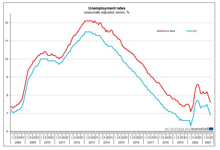Στο 7,6% υποχώρησε η ανεργία στην ευρωζώνη τον Ιούλιο, από 7,8% τον Ιούνιο και από 8,4% τον περσινό Ιούλιο.