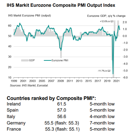 Ο Σεπτέμβριος ήταν ο δεύτερος διαδοχικός μήνας που οι επιχειρήσεις της ευρωζώνης κατέβασαν ταχύτητα από το υψηλό των 15 ετών που είχαν σκαρφαλώσει τον Ιούλιο, καθώς οι ελλείψεις πρώτων υλών είχαν επίπτωση και στη μεταποίηση και στις υπηρεσίες.