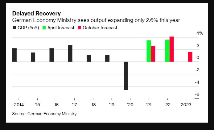 Η Γερμανία αναμένει ότι η ανάπτυξη φέτος θα είναι σημαντικά πιο αδύναμη από ό,τι είχε προβλεφθεί, καθώς οι παρατεταμένες επιπτώσεις της πανδημίας και οι πιέσεις στην προσφορά εμποδίζουν την πορεία της μεγαλύτερης οικονομίας της Ευρώπης.