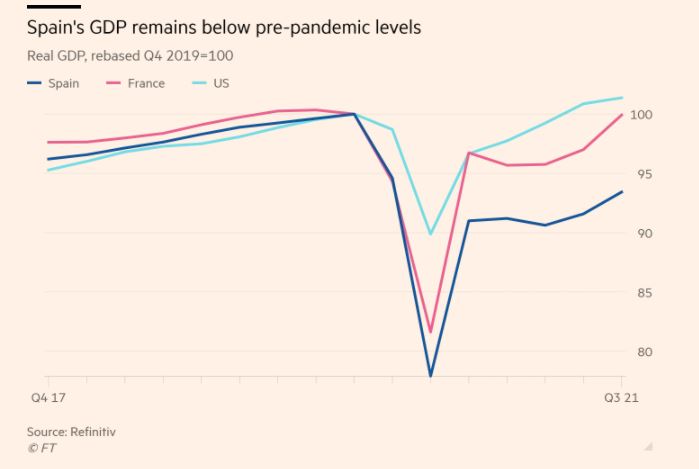 Πολύ χαμηλότερα από το σημείο που ήταν προ πανδημίας βρίσκεται η Ισπανία. Το ΑΕΠ αυξήθηκε 2% το τρίτο τρίμηνο σε σύγκριση με ένα τρίμηνο πριν, επιταχύνοντας από το 1,1% που είχε τρεις μήνες πριν, αλλά επιβραδύνοντας από το 2,7% που προέβλεπαν οι οικονομολόγοι. Η ισπανική οικονομία βρίσκεται ακόμη 6,6% χαμηλότερα από τα προ πανδημίας επίπεδα που ήταν στο τέλος του 2019.