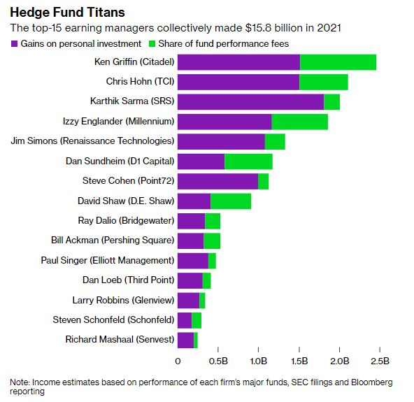Η προηγούμενη χρονιά ήταν δύσκολη για πολλούς μάνατζερ, καθώς οι ανησυχίες για τον πληθωρισμό και τη νομισματική πολιτική έπληξαν τις μετοχές και τα ομόλογα, προκαλώντας προβληματισμό στους αγοραστές μετοχών καθώς και στα macro funds όπως η Element Capital, της οποίας ο ιδρυτής Jeff Talpins εξαφανίστηκε επίσης από την κατάταξη του Bloomberg. Η περασμένη χρονιά ήταν μία έκπληξη σε σύγκριση με το 2020, τότε που η άνοδος των αγορών είχε οδηγήσει τους τιτάνες των hedge funds σε κέρδη-ρεκόρ, με τους 15 κορυφαίους διαχειριστές να κερδίζουν συνολικά 23 δισ. δολάρια. Αυτή τη φορά, το 2021 έφερε ένα πιο μέτριο ποσό ύψους 15,8 δισ. δολαρίων.