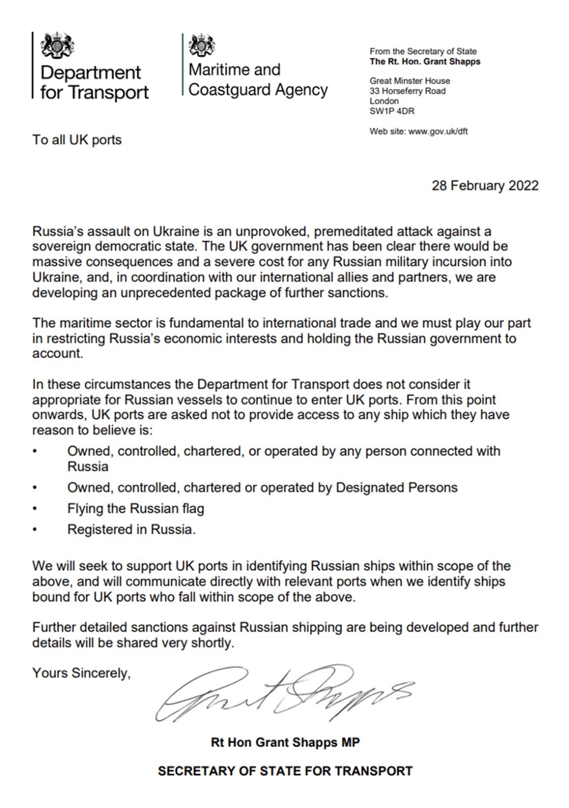Ο Βρετανός υπουργός Μεταφορών Γκραντ Σαπς ανέφερε σε επιστολή του προς όλα τα λιμάνια του Ηνωμένου Βασιλείου ότι προετοιμάζονται περαιτέρω λεπτομερείς κυρώσεις κατά της ρωσικής ναυτιλίας μετά την εισβολή της Ρωσίας στην Ουκρανία.