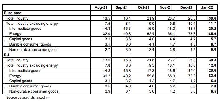 Σε σύγκριση με τον Ιανουάριο του 2021, ο πληθωρισμός χονδρικής έφτασε στο 30,6% στην ευρωζώνη και στο 30,3% στην ΕΕ.