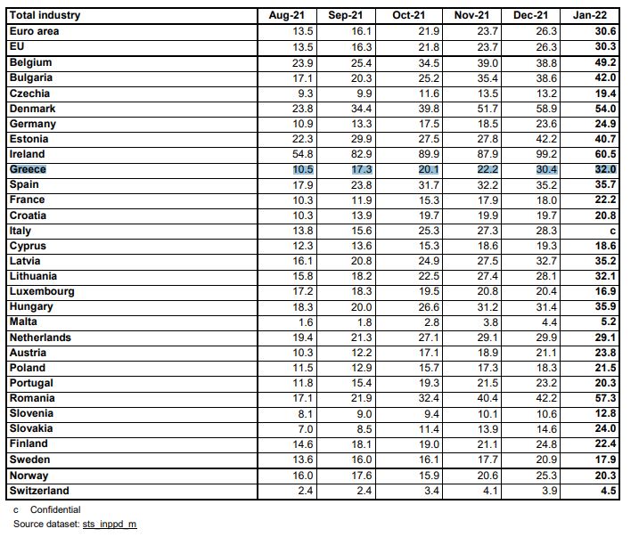 Για τη χώρα μας, η Eurostat ενημέρωσε ότι ο ετήσιος πληθωρισμός χονδρικής τον Ιανουάριο ανήλθε στο 32% από 30,4% τον Δεκέμβριο. Σύμφωνα με την Ελληνική Στατιστική Υπηρεσία, η ετήσια αύξηση των τιμών παραγωγού στη Βιομηχανία ήταν 31,6%.