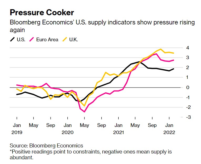 Σύμφωνα με τους δείκτες προσφοράς που ανέπτυξε το Bloomberg Economics, οι πιέσεις στις ΗΠΑ και στην Ευρώπη εντάθηκαν τον Φεβρουάριο, μετά από αρκετούς μήνες βελτίωσης. Στοιχεία που ακόμα δεν έχουν δημοσιευθεί και αφορούν τον Μάρτιο δείχνουν ότι η εικόνα αυτή θα διατηρηθεί, οι πιέσεις δεν θα υποχωρήσουν.