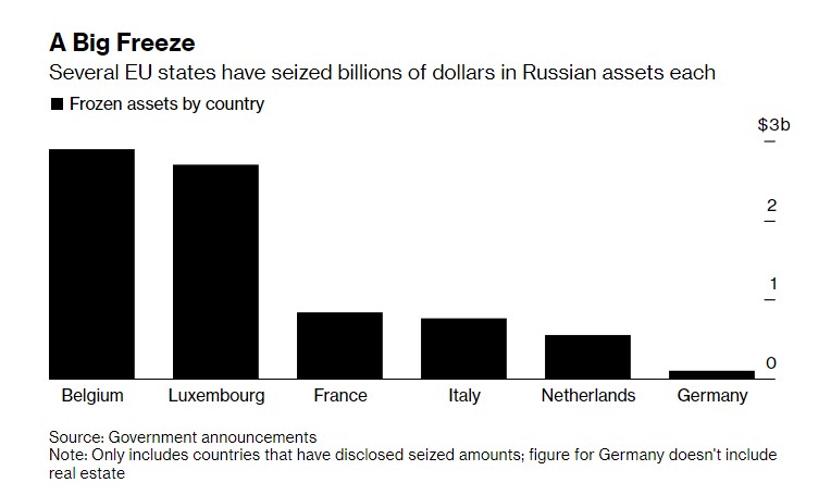 Περιουσιακά στοιχεία ύψους 29,5 δισ. ευρώ (32,1 δισ. δολάρια) που συνδέονται με Ρώσους και Λευκορώσους ιδιώτες και εταιρείες έχουν παγώσει οι χώρες της Ευρωπαϊκής Ένωσης, από τότε που υιοθετήθηκαν οι πρώτες κυρώσεις εξαιτίας της ρωσικής εισβολής στην Ουκρανία.