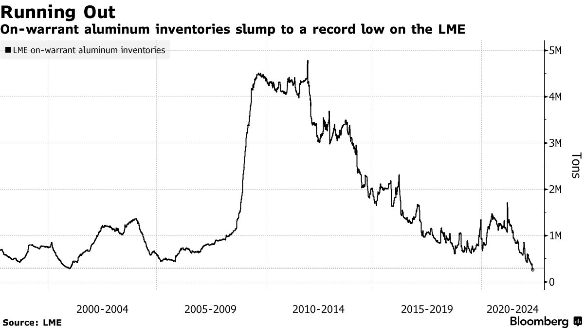 Σε χαμηλό ρεκόρ υποχώρησαν τα άμεσα διαθέσιμα αποθέματα αλουμινίου στις αποθήκες του Χρηματιστηρίου Μετάλλων του Λονδίνου, σε μία ακόμη ένδειξη της αυξανόμενης έντασης στην παγκόσμια αγορά μετάλλων.