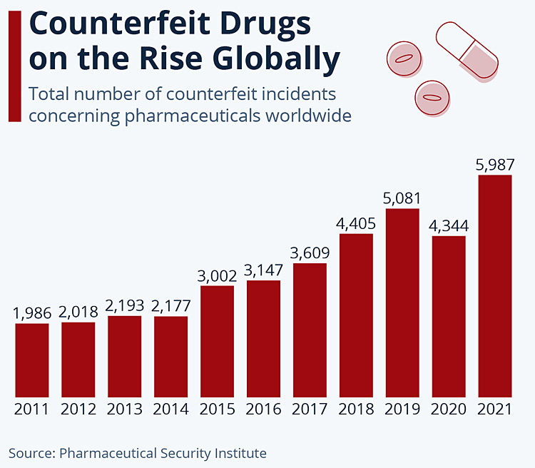 Αυξάνονται τα πλαστά φάρμακα, σύμφωνα με στοιχεία του Ινστιτούτου Φαρμακευτικής Ασφάλειας. Σχεδόν 6.000 περιστατικά φαρμακευτικής εγκληματικότητας καταγράφηκαν από τον μη κερδοσκοπικό οργανισμό το 2021, αυξημένα κατά 38 τοις εκατό σε σχέση με το προηγούμενο έτος και το υψηλότερο ποσοστό από τότε που ξεκίνησαν τα αρχεία τους πριν από 20 χρόνια.