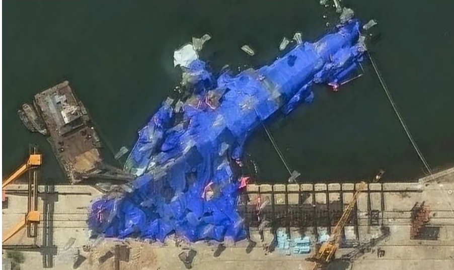 Δορυφορικές εικόνες δείχνουν το πολεμικό πλοίο – καλυμμένο με μπλε μουσαμάδες – να έχει γείρει στο πλάι, με την πρύμνη στραμμένη προς το λιμάνι και την πλώρη να παραμένει στη ράμπα, σύμφωνα το αμερικανικό Κέντρο Στρατηγικών και Διεθνών Σπουδών (CSIS).