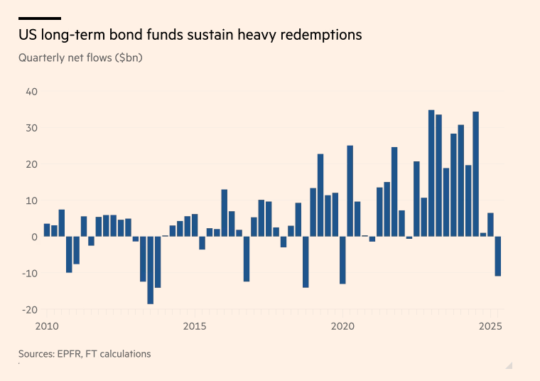 Οι καθαρές εκροές από μακροπρόθεσμα αμερικανικά ομολογιακά αμοιβαία κεφάλαια που καλύπτουν κρατικό και εταιρικό χρέος έχουν φθάσει σχεδόν τα 11 δισ. δολάρια μέχρι στιγμής στο δεύτερο τρίμηνο, σύμφωνα με υπολογισμούς των Financial Times που βασίζονται σε στοιχεία της EPFR.