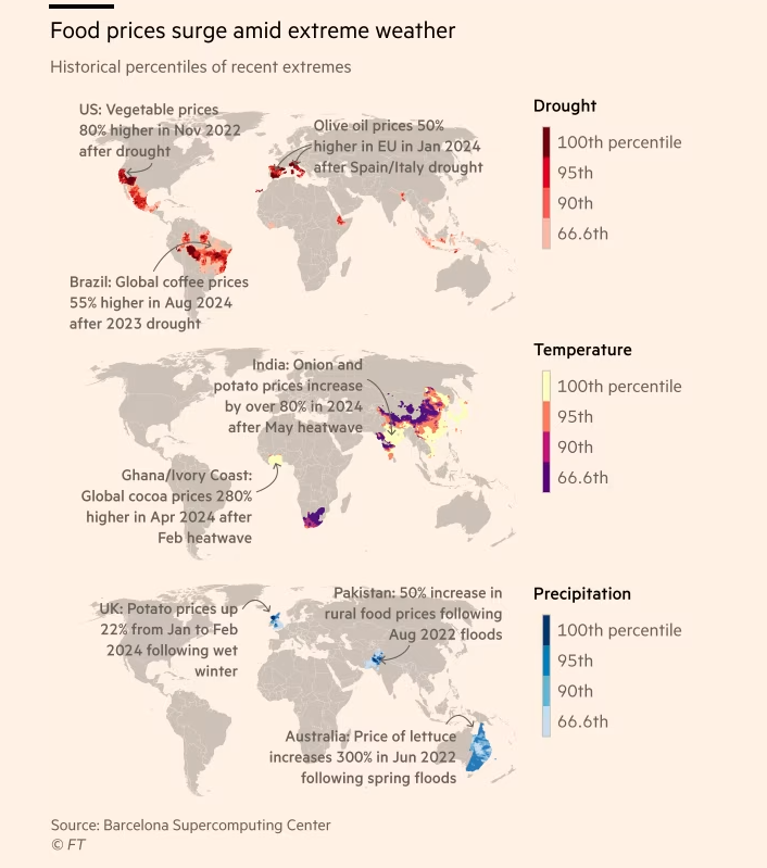 Οπως μεταδίδουν οι Financial Times, μελέτη με επικεφαλής το Κέντρο Υπερυπολογιστών της Βαρκελώνης συνδέει άμεσα δεκάδες ακραίες κλιματικές συνθήκες με απότομες αυξήσεις των τιμών των τροφίμων, αναδεικνύοντας την αυξανόμενη ευπάθεια των συστημάτων τροφίμων σε περιβαλλοντικά σοκ.