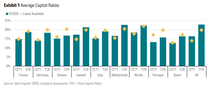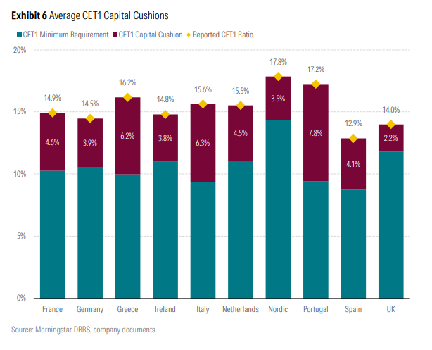Παρά τις υψηλότερες ρυθμιστικές αντιξοότητες, τις υψηλότερες αμοιβές των μετόχων και την κάπως μειωμένη κερδοφορία, οι ευρωπαϊκές τράπεζες διατηρούν γενικά άφθονα κεφαλαιακά μαξιλάρια πάνω από τις κανονιστικές απαιτήσεις. Με βάση τα τελευταία διαθέσιμα στοιχεία στο τέλος Μαρτίου 2025, οι τράπεζες στην Ελλάδα, την Ιταλία και την Πορτογαλία παρουσίασαν τα υψηλότερα κεφαλαιακά αποθέματα έναντι των ελάχιστων απαιτήσεων για τον δείκτη CET1, ενώ οι ιρλανδικές, οι σκανδιναβικές και οι βρετανικές τράπεζες διαθέτουν πιο περιορισμένα, αν και ακόμη επαρκή, μαξιλάρια, τα οποία αντανακλούν επίσης τις υψηλότερες απαιτήσεις.