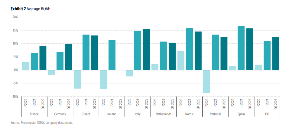 Χάρη στο περιβάλλον υψηλότερων επιτοκίων, τα καθαρά έσοδά τους από τόκους (NII) έχουν αυξηθεί, συμβάλλοντας σε υψηλότερα κέρδη. Με βάση τα τελευταία διαθέσιμα στοιχεία στα τέλη Μαρτίου του 2025, οι τράπεζες στη Γαλλία, τη Γερμανία, την Ελλάδα, την Ιταλία, την Πορτογαλία και την Ισπανία ανέφεραν όλοι υψηλότερους δείκτες κεφαλαίου σε σύγκριση με τα επίπεδα του 2020.