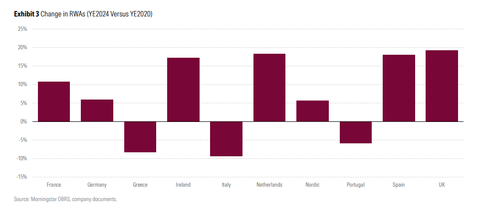 Οι ελληνικές, ιταλικές και πορτογαλικές τράπεζες παρουσίασαν μείωση των περιουσιακών στοιχείων με κίνδυνο (Risk Weighted Assets, RWAs) από το 2020 έως το 2024, υποβοηθούμενες από τις προσπάθειές τους για μείωση του κινδύνου. Η αύξηση των RWAs σε άλλες χώρες επηρεάζεται από την οργανική ανάπτυξη των δραστηριοτήτων και, σε ορισμένες περιπτώσεις, από εξαγορές.