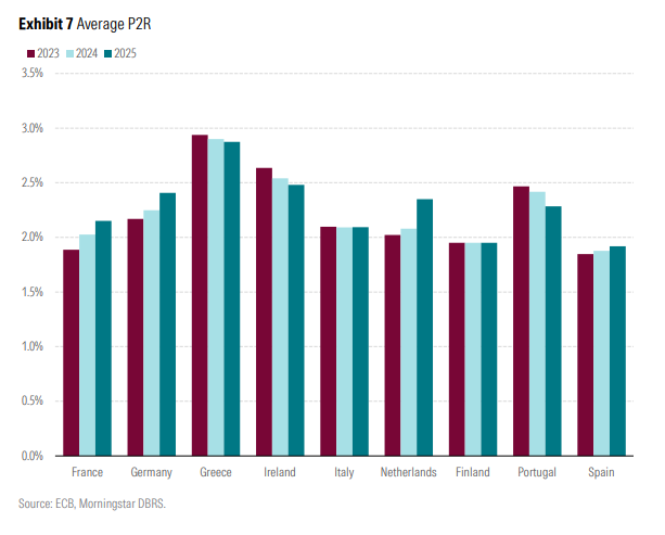 Η διατήρηση αυτών των επιπέδων αποθέματος ασφαλείας καθίσταται όλο και πιο σημαντική, αν ληφθεί υπόψη ότι η απαίτηση του Πυλώνα 2 (P2R) παρέμεινε σταθερή ή αυξήθηκε από το 2022 για τις περισσότερες τράπεζες στην Ευρώπη, σύμφωνα με τα στοιχεία της ΕΚΤ από τον Μάιο του 2025.