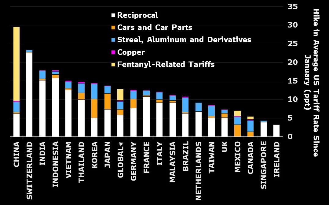 Εάν οι νέοι δασμοί τεθούν σε ισχύ σε επτά ημέρες όπως έχει προγραμματιστεί και εάν οι συμφωνίες για τους δασμούς στα αυτοκίνητα με την Ευρωπαϊκή Ένωση, την Ιαπωνία και τη Νότια Κορέα παραμείνουν σε ισχύ, το Bloomberg Economics εκτιμά ότι ο μέσος δασμολογικός συντελεστής των ΗΠΑ θα αυξηθεί από 13,3% σε 15,2% - σημαντική αύξηση σε σχέση με το 2,3% που ίσχυε πριν την ανάληψη της προεδρίας από τον Τραμπ.
