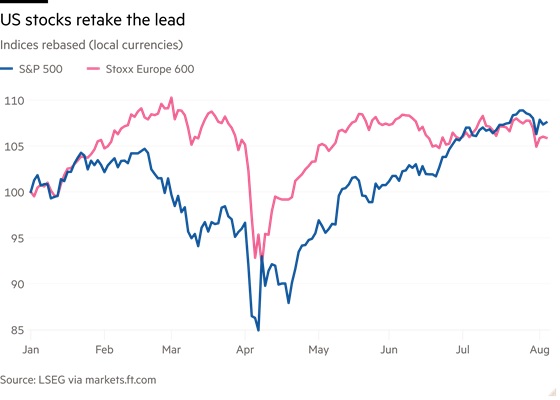 Όμως η υπεραπόδοση κράτησε λίγο. Τα ισχυρά κέρδη των αμερικανικών mega caps έστειλαν και πάλι τις μετοχές της Wall Street σε ανοδική τροχιά, παρά την επίθεση των δασμών του Τραμπ και τα επιδεινούμενα οικονομικά στοιχεία των ΗΠΑ. Τα ασθενή κέρδη του δεύτερου τριμήνου στην Ευρώπη ενίσχυσαν την αυξανόμενη άποψη ότι το ράλι των μετοχών της περιοχής χάνει δυναμική.