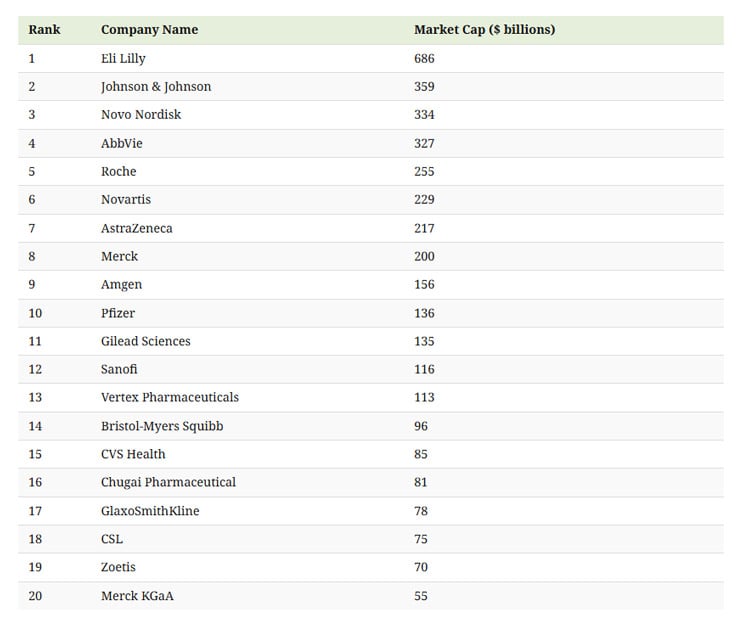 Υπάρχουν δύο άλλες εταιρείες με κεφαλαιοποίηση αγοράς άνω των 300 δισεκατομμυρίων δολαρίων: η Novo Nordisk με 334 δισ. δολ. και η AbbVie με 327 δισ. δολ.