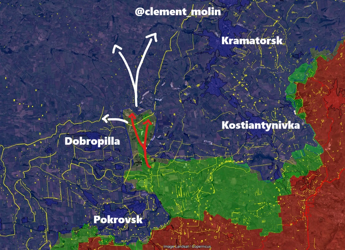 Η ρωσική προέλαση, επέκταση της επίθεσης ανάμεσα σε Ποκρόβσκ και Κοστιαντινίβκα που έχει ξεκινήσει από την άνοιξη, επιταχύνθηκε σημαντικά μέσα στον Αύγουστο, φέρνοντας βασικές ουκρανικές οδούς εφοδιασμού στο βεληνεκές των ρωσικών drones (FPV).
