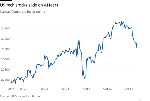 Οι απώλειες στις τεχνολογικές μετοχές έρχονται εν μέσω προειδοποιήσεων ότι ο ενθουσιασμός γύρω από την τεχνητή νοημοσύνη μπορεί να έχει υπερβεί τα όρια, μετά από μελέτη παραρτήματος του Ινστιτούτου Τεχνολογίας της Μασαχουσέτης (MIT) που δημοσιεύτηκε τη Δευτέρα και προειδοποίησε ότι το 95% των εταιρειών που ερωτήθηκαν δεν είχαν δει αποδόσεις από επενδύσεις στη «γενετική» τεχνητή νοημοσύνη.