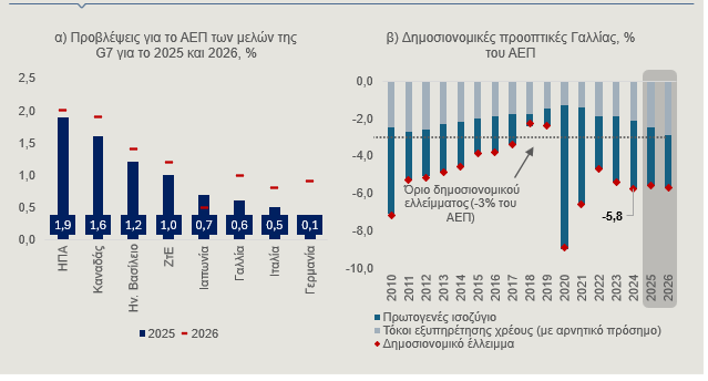 Η Γαλλία, η δεύτερη μεγαλύτερη οικονομία της Ευρωζώνης και μέλος της ομάδας των G7, αναμένεται να έχει ισχνή ανάπτυξη το τρέχον έτος, στο 0,6% και να αναπτυχθεί κατά 1% το 2026. Όμως, πέρα από τις γεωπολιτικές εντάσεις, η γαλλική κυβέρνηση είναι αντιμέτωπη με τον εκτροχιασμό των δημόσιων οικονομικών της, με υψηλό δημοσιονομικό έλλειμμα στο 5,8% του ΑΕΠ το 2024 και ραγδαία αύξηση του δημοσίου χρέους, στο 113% του ΑΕΠ το 2024.