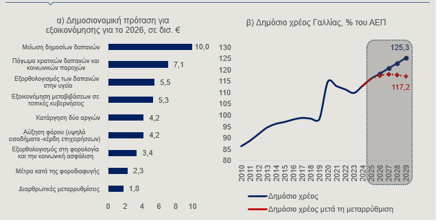 Επίσης, πρότεινε την κατάργηση δύο εθνικών αργιών, με στόχο την εξοικονόμηση πόρων και την ενίσχυση της παραγωγικότητας, ενώ πρότεινε την αύξηση της φορολογίας στα υψηλά εισοδήματα και έκτακτο φόρο επί των υπερβολικών κερδών των επιχειρήσεων. Στόχος είναι να μειωθεί το δημοσιονομικό έλλειμμα στο 4,6% το 2026, από 5,4% το 2025 και να φθάσει το 2,8% το 2029, αν και το σχέδιο χαρακτηρίζεται ως φιλόδοξο (Scope Ratings, 17 Ιουλίου 2025). Ελλείψει, όμως, μίας αξιόπιστης μεσοπρόθεσμης στρατηγικής για τη δημοσιονομική εξυγίανση, τα ελλείμματα αναμένεται να παραμείνουν σε ιδιαίτερα υψηλά επίπεδα.