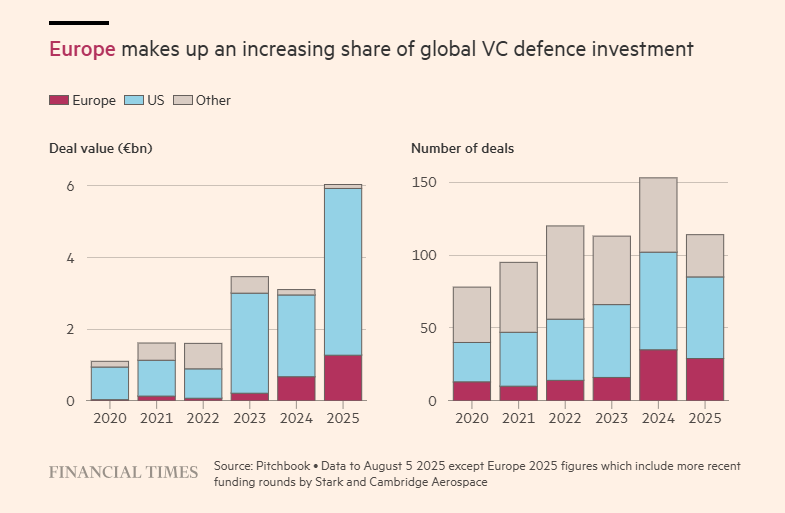 Oπως μεταδίδουν οι Financial Times, η επενδυτική στροφή είναι εμφανής: Σήμερα η Ευρώπη διαθέτει τρεις «μονόκερους» αμυντικής τεχνολογίας -με αξία άνω του 1 δισ. ευρώ- (Helsing, Quantum Systems, Tekever), ενώ πολλές άλλες εταιρείες αναπτύσσουν drones, υποβρύχια ή ακόμα και βιο-ρομποτικά έντομα για αποστολές κατασκοπείας.