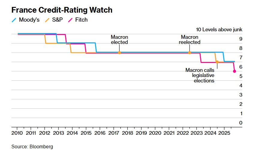 Η Fitch Ratings υποβάθμισε τη Γαλλία, επισημαίνοντας ότι η αναταραχή από τις επανειλημμένες καταρρεύσεις κυβερνήσεων έχει εγκλωβίσει τη χώρα σε μια διαρκή μάχη για τον περιορισμό του διογκούμενου χρέους.