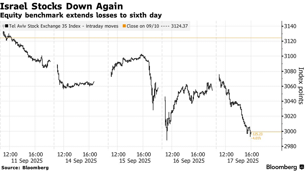 Ο βασικός δείκτης υποχώρησε κατά 1,8%, με τη συνολική πτώση από τις 9 Σεπτεμβρίου να φθάνει στο 4,3%. Ενώ οι επενδυτές σε μετοχές αποσύρονται σταθερά από την αγορά αυτή την εβδομάδα, δεν έχει παρατηρηθεί σημαντική κίνηση στο ισραηλινό σέκελ ή στα ομόλογα σε δολάριο.
