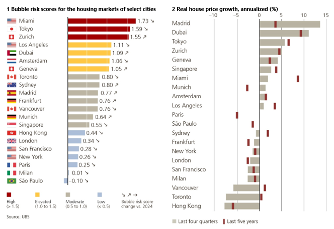 Οι παγκόσμιες αγορές κατοικίας συνέχισαν να επιβραδύνονται κατά μέσο όρο. Ο Matthias Holzhey, επικεφαλής συντάκτης της μελέτης στο Chief Investment Office της UBS Global Wealth Management, εξηγεί: «Η ευρεία έξαρση έχει υποχωρήσει, με τον μέσο κίνδυνο φούσκας στις μεγάλες πόλεις να μειώνεται για τρίτη συνεχόμενη χρονιά». Οι πόλεις που επισημάνθηκαν με υψηλό κίνδυνο φούσκας το 2021, όπως η Φρανκφούρτη, το Παρίσι, το Τορόντο, το Χονγκ Κονγκ ή το Βανκούβερ, κατέγραψαν μέση μείωση πραγματικών τιμών σχεδόν 20% από τα υψηλά τους, λόγω της αύξησης των επιτοκίων τα χρόνια που ακολούθησαν. Συγκριτικά, οι πραγματικές τιμές σε πόλεις με μικρότερες ανισορροπίες μειώθηκαν περίπου κατά 5% κατά μέσο όρο.