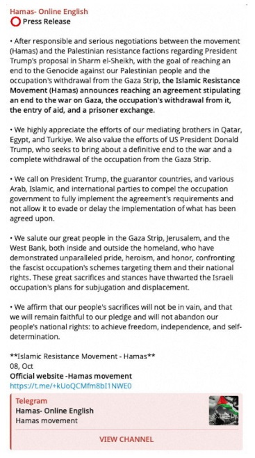 Η Χαμάς ανακοίνωσε την Πέμπτη ότι επετεύχθη συμφωνία για τον τερματισμό του πολέμου στη Γάζα, έπειτα από συνομιλίες βασισμένες σε πρόταση του Ντόναλντ Τραμπ. Η οργάνωση ανέφερε ότι η συμφωνία περιλαμβάνει απόσυρση των ισραηλινών δυνάμεων από τον παλαιστινιακό θύλακα, καθώς και ανταλλαγή ομήρων και κρατουμένων. Σε ανακοίνωσή της, η Χαμάς κάλεσε τον Τραμπ και τα κράτη εγγυητές να διασφαλίσουν ότι το Ισραήλ θα εφαρμόσει πλήρως τη συμφωνημένη κατάπαυση του πυρός.