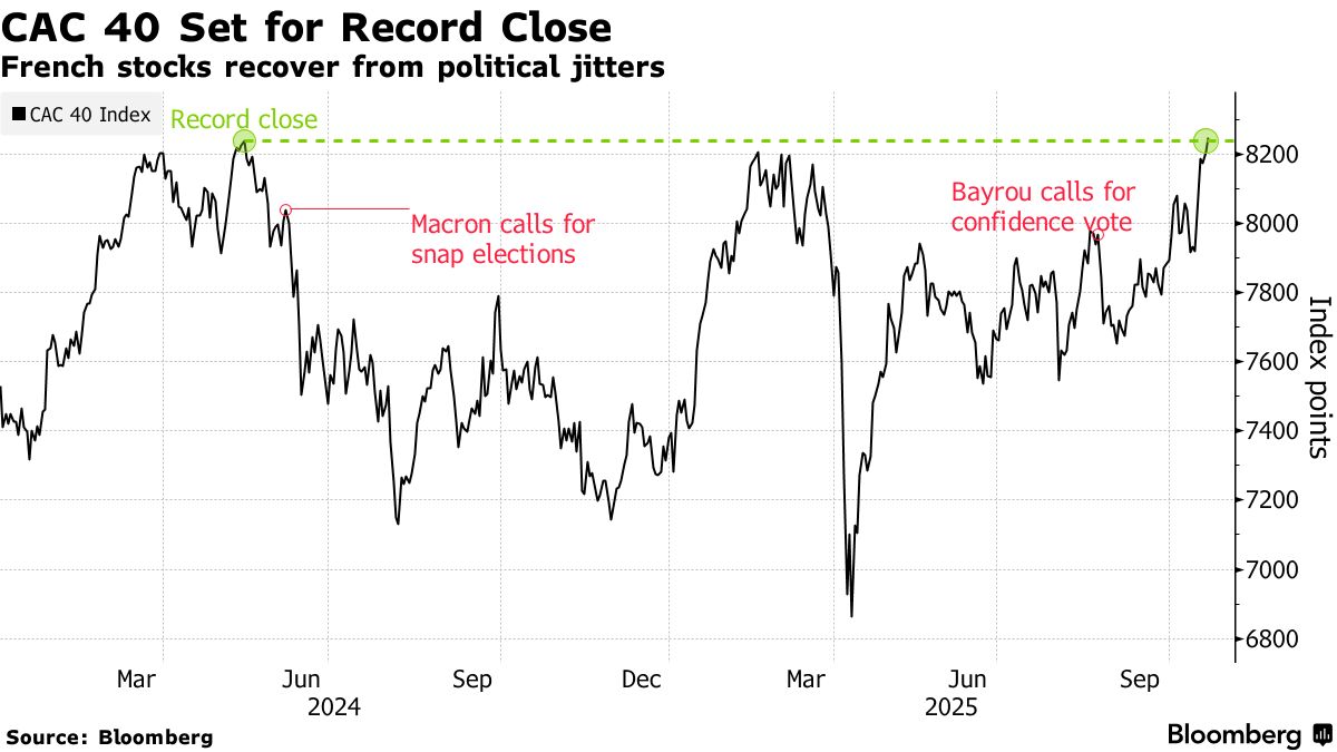 Πάνω από το ρεκόρ κλεισίματος του Μαΐου 2024 ανήλθαν οι γαλλικές μετοχές, καθώς τα ισχυρά εταιρικά κέρδη αντιστάθμισαν τις ανησυχίες για την πολιτική αναταραχή της χώρας και τις προοπτικές της πιστοληπτικής της ικανότητας.