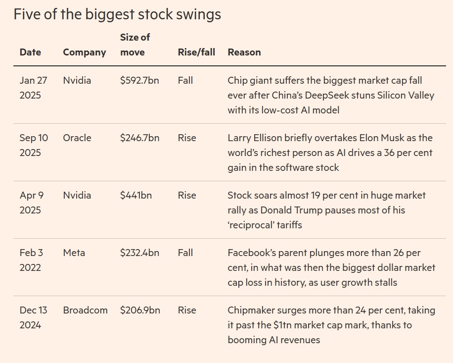 Μεμονωμένες μετοχές έχουν κερδίσει ή χάσει πάνω από 100 δισ. δολάρια σε χρηματιστηριακή αξία μέσα σε μία μόνο ημέρα 119 φορές φέτος, το υψηλότερο ετήσιο σύνολο που έχει καταγραφεί ποτέ γράφουν οι Financial Times.