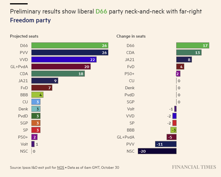 Το φιλελεύθερο κεντρώο κόμμα D66 βρίσκεται σε ισοπαλία με το ακροδεξιό κόμμα Ελευθερία για την πρωτιά στις Ολλανδικές εκλογές, με το 98% των ψήφων να έχει καταμετρηθεί. Και τα δύο κόμματα προβλέπεται να κερδίσουν 26 έδρες, με μόνο ένα μικρό αριθμό ψήφων να απομένει να καταμετρηθεί την Πέμπτη.