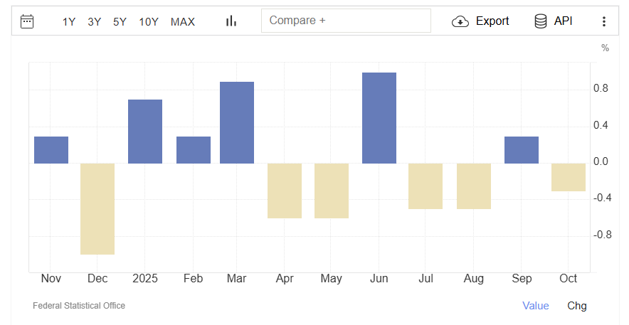 Κατά 0,3% υποχώρησαν σε μηνιαία βάση οι λιανικές πωλήσεις στη Γερμανία τον Οκτώβριο, διαψεύδοντας τις προβλέψεις της αγοράς για αύξηση 0,2% και αντιστρέφοντας την οριακά αναθεωρημένη αύξηση 0,3% του προηγούμενου μήνα.