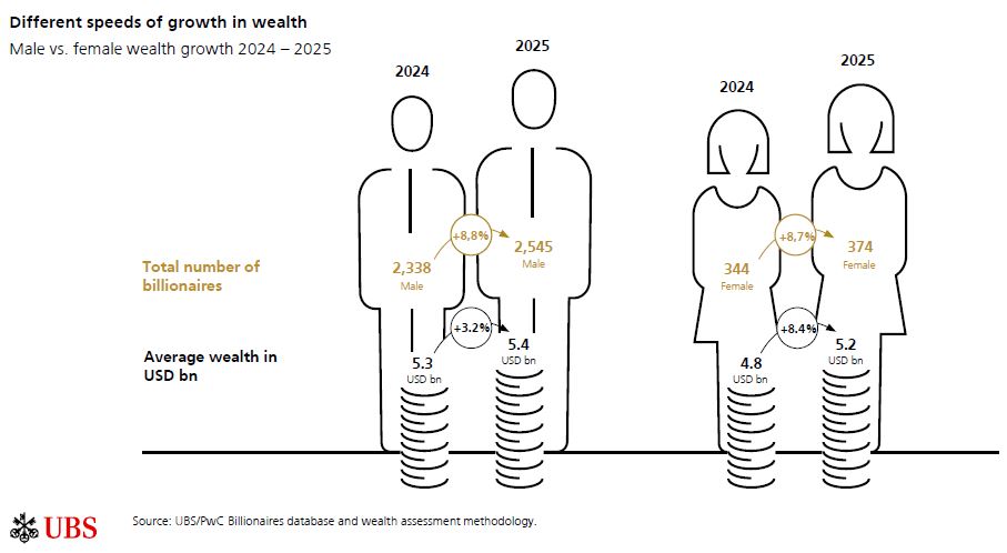 Ο μέσος πλούτος των γυναικών συνέχισε επίσης να αυξάνεται το 2025, κατά 8,4% στα 5,2 δισεκατομμύρια δολάρια, δηλαδή περισσότερο από το διπλάσιο του ρυθμού αύξησης των ανδρών (3,2% στα 5,4 δισεκατομμύρια δολάρια). Ενώ οι γυναίκες ανέρχονται πλέον σε 374 δισεκατομμυριούχους έναντι 2.545 ανδρών, τους έχουν ξεπεράσει στη συσσώρευση πλούτου για τέσσερα συνεχόμενα χρόνια.