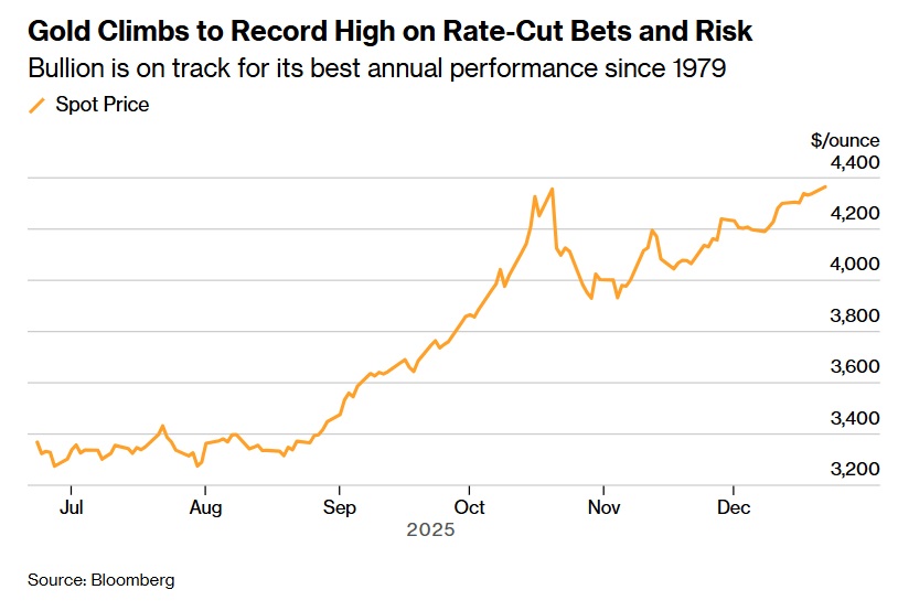 Το πολύτιμο μέταλλο ενισχύθηκε πάνω από 1,5%, ξεπερνώντας το προηγούμενο ρεκόρ των 4.381 δολαρίων ανά ουγγιά που είχε καταγραφεί τον Οκτώβριο. Οι επενδυτές στοιχηματίζουν ότι η Ομοσπονδιακή Τράπεζα των ΗΠΑ (Federal Reserve) θα προχωρήσει σε δύο μειώσεις επιτοκίων το 2026, μετά από σειρά οικονομικών στοιχείων που δημοσιεύθηκαν την περασμένη εβδομάδα, ενώ και ο πρόεδρος των ΗΠΑ, Ντόναλντ Τραμπ, έχει ταχθεί υπέρ μιας πιο χαλαρής νομισματικής πολιτικής. Τα χαμηλότερα επιτόκια συνήθως λειτουργούν υποστηρικτικά για τα πολύτιμα μέταλλα, τα οποία δεν αποδίδουν τόκο, θυμίζει το Bloomberg.