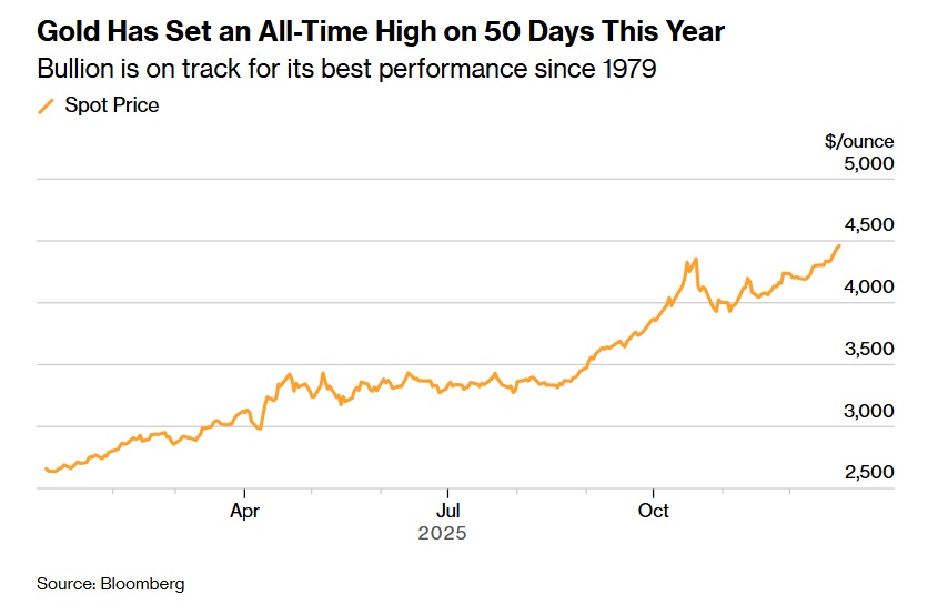 Ο χρυσός βρίσκεται σε ιστορικό υψηλό — για 50ή φορά φέτος — λόγω της κλιμάκωσης των γεωπολιτικών εντάσεων και των προοπτικών για περισσότερες μειώσεις επιτοκίων στις ΗΠΑ. Και το ασήμι κατέγραψε επίσης νέο ιστορικό ρεκόρ, γράφει το Bloomberg.