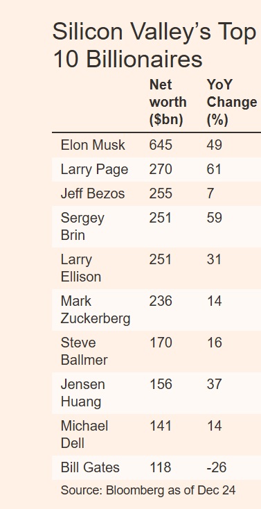 Οι 10 κορυφαίοι ιδρυτές και διευθύνοντες σύμβουλοι τεχνολογικών εταιρειών στις ΗΠΑ κατείχαν πάνω από 2,5 τρισ. δολάρια σε μετρητά, μετοχές και άλλες επενδύσεις στο κλείσιμο των συναλλαγών στη Νέα Υόρκη την παραμονή των Χριστουγέννων, σύμφωνα με στοιχεία του Bloomberg.