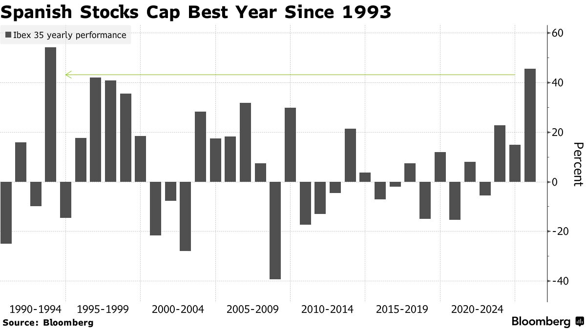 Ο δείκτης αναφοράς της χώρας, Ibex 35, είχε κερδίσει 50% φέτος μέχρι το κλείσιμο της Τρίτης, γεγονός που αποτελεί την υψηλότερη απόδοση σε 32 χρόνια και τη καλύτερη επίδοση μεταξύ των μεγάλων ευρωπαϊκών αγορών.