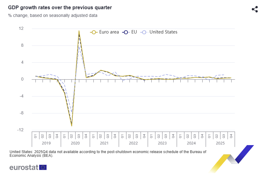 Το τέταρτο τρίμηνο του 2025, το εποχικά προσαρμοσμένο ΑΕΠ αυξήθηκε κατά 0,3% τόσο στην Ευρωζώνη όσο και στην Ευρωπαϊκή Ένωση, σε σύγκριση με το προηγούμενο τρίμηνο, σύμφωνα με την δεύτερη εκτίμηση που δημοσίευσε η Eurostat, η στατιστική υπηρεσία της ΕΕ. Το τρίτο τρίμηνο του 2025, το ΑΕΠ είχε αυξηθεί κατά 0,3% στην Ευρωζώνη και κατά 0,4% στην ΕΕ.