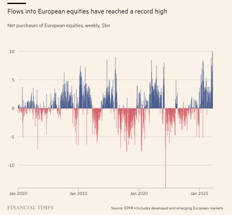 Ρεκόρ κεφαλαίων στις ευρωπαϊκές μετοχές στέλνουν οι επενδυτές παγκοσμίως, με στόχο να μειώσουν την έκθεσή τους στις ΗΠΑ και να επωφεληθούν από τη δυναμική των αγορών της Ευρώπης.