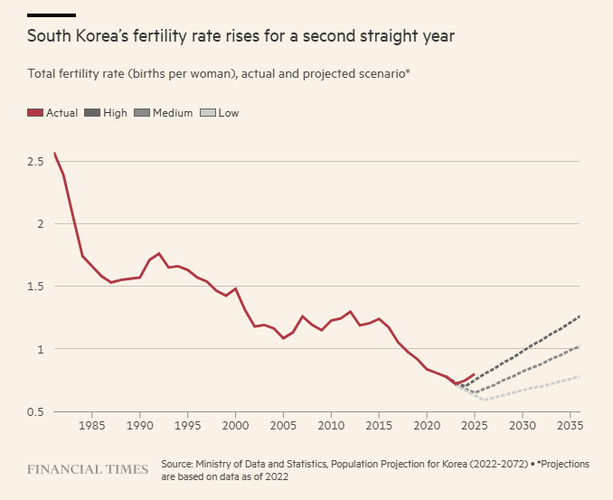 Οπως μεταδίδουν οι Financial Times, ο δείκτης γονιμότητας στην Κορέα -ο μέσος αριθμός παιδιών που αναμένεται να έχει μια γυναίκα κατά τη διάρκεια της ζωής της- αυξήθηκε στο 0,8 πέρυσι, από 0,75 το 2024 και από το ιστορικό χαμηλό του 0,72 το 2023, σύμφωνα με τα επίσημα στοιχεία.